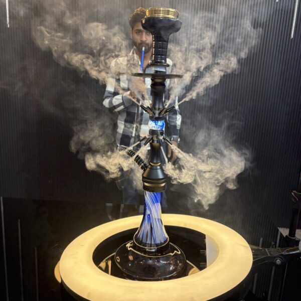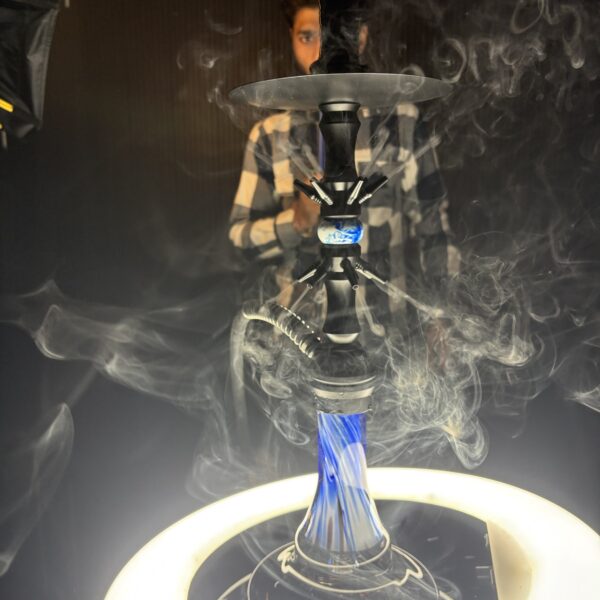 VG France 11-inch stainless steel hookah features a Blue stem, grey glass base, inbuilt diffuser, X-function, and a ceramic skull chillum, making it portable, easy to clean, and perfect for versatile use. Includes a silicone pipe, tongs, and coal tray for seamless sessions.