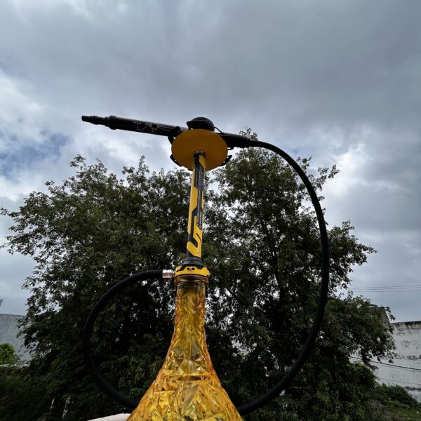 The El Bomber Jack Hookah – Yellow Edition is a 30-inch premium shisha designed with a sturdy transparent glass base and sleek Yellow stem. Comes complete with a silicone chillum, HMD, diffuser, premium silicone pipe with designer metal handle, and fancy coal tray. Perfect for stylish smokers who value both performance and elegance.